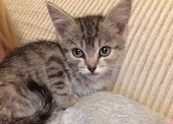 Ласковый, милый, игривый, серенький котёнок. Кушает всё, ходит в латок)